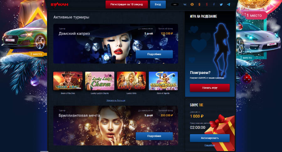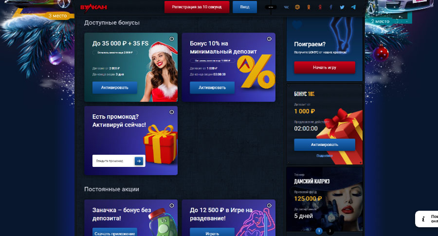 Все бонусные подарки (за взнос на депозит и бездеп) доступны на официальном сайте или зеркалах Vulcan.